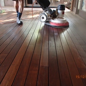 From there, you pour it over your deck and use the ‘wet mop’ method to cover your timber boards completely. After letting the solution sit for the recommended duration, typically 15-20 minutes, pour additional cleaner over the timber and start scrubbing with a hard bristled broom or decking brush. Scrub with the grain in smooth motions to bring out a dirt and oils and then hose your deck down thoroughly.